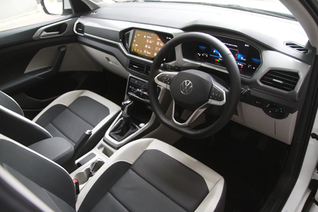 T-Cross memiliki tata letak dashboard modern dengan beberapa aksen menarik, ruang penyimpanan yang cerdas, lampu ambient serta jok kulit berventilasi di bagian depan, membuat pengemudi dan penumpang merasa semakin nyaman. Beberapa sentuhan modern pada interior T-Cross disuguhkan oleh panel instrumen digital berlayar 8 inci serta AC otomatis dengan tombol kontrol sentuh.
